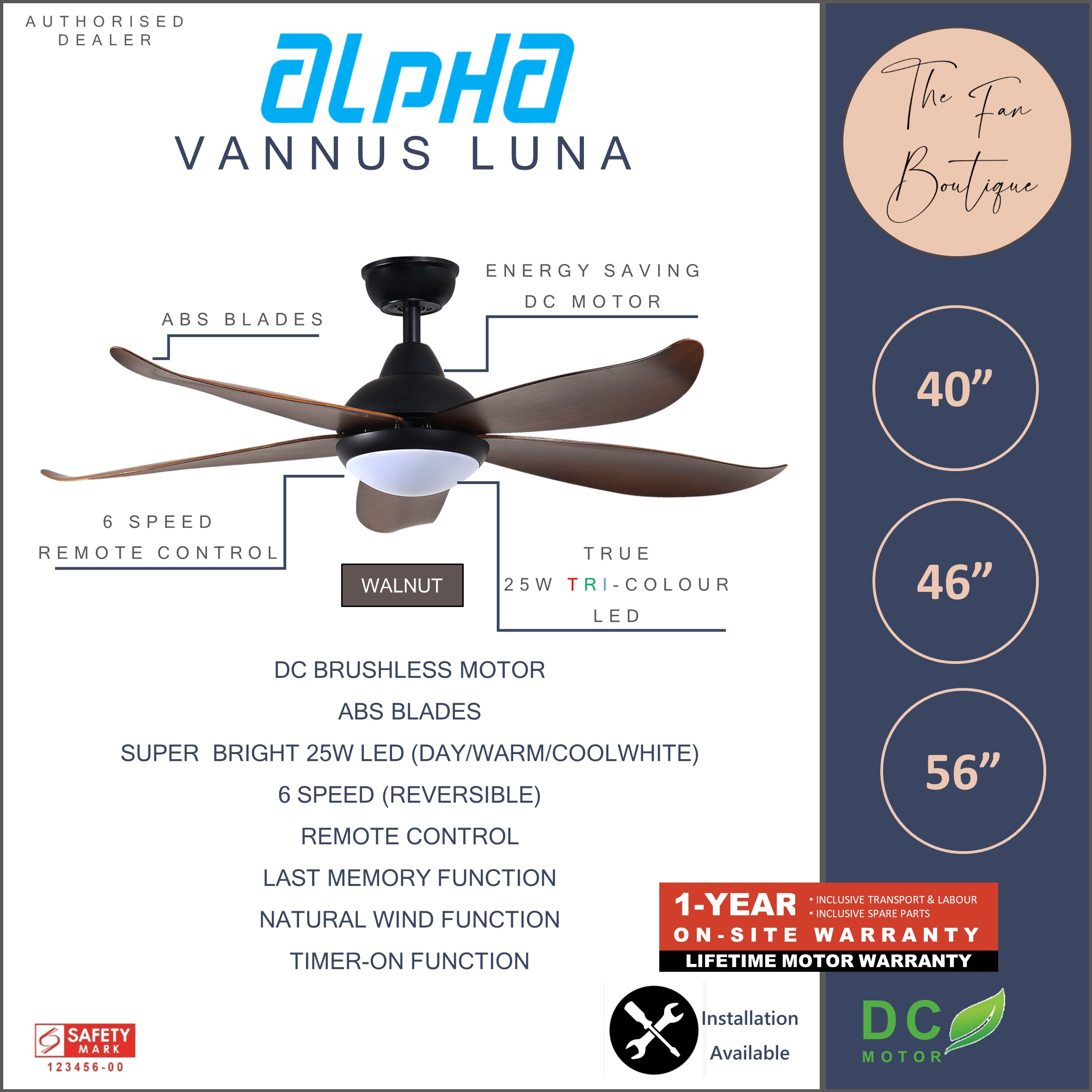 ALPHA Vannus Luna 46" DC Motor Ceiling Fan with 25w LED Light and Remote Control