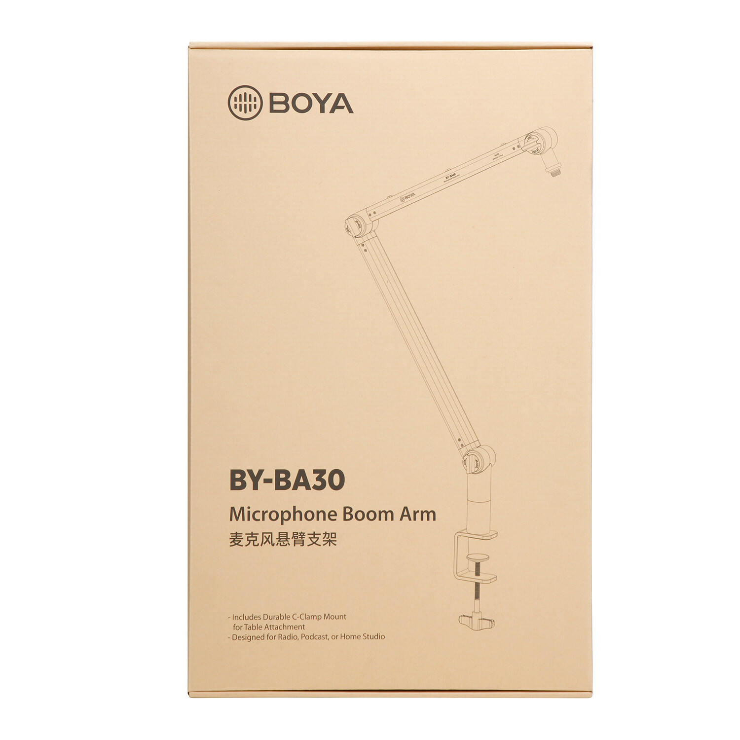 The BOYA BY-BA30 is a microphone boom arm, giving users with experience improvements when using their microphone. It can provide a maximum arm reach of 17" (horizontallength)/ 26" (vertical height). The boom arm can be attached to a desk via its C-clampmount , which can offers a stable placement on desktop operation.