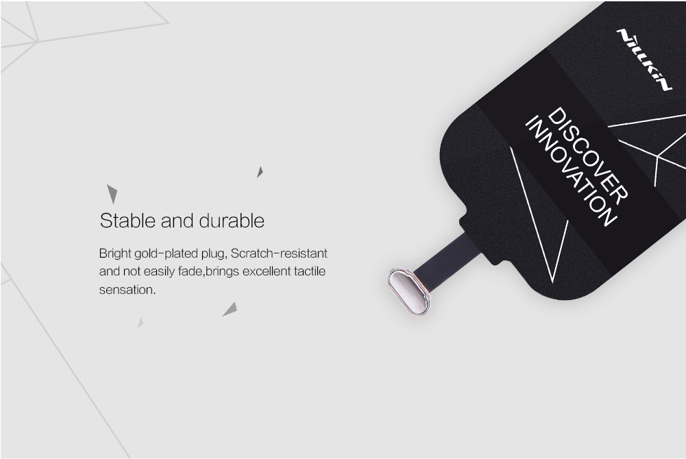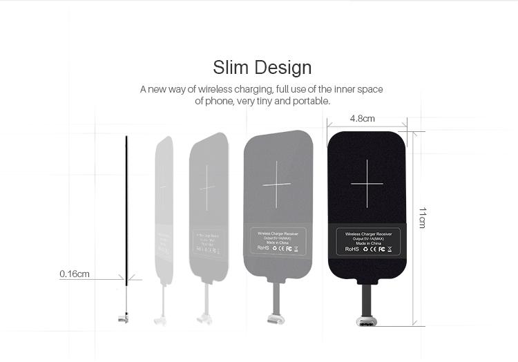Wireless Charging ReceiverNillin wireless charging receiver makes quick wireless charging with cable freeOutput: 5V/1A(Max)Charge Efficiency: Around 70%Standard: Qi Wireless Charging StandardSlim Design - A new way of wireless charging, full use of the inner space of phone, very tiny & portable,Stable and durable - The metal type-C interface made by meticulous workmanship is reversible. Compartible with all kinds of phone with Type-C interface. The metal eletroplating shell is stable.Plastic Tiny Tag - Precise technique process produces stable and durable magic tags with more excellent transmission performance.Precise technique process - Plastic tiny tag, with higher resistance to wear comparing with ordinary tag, is more waterproof and stain-resistant.Texas Instruments - Texas Instruments is a global leading analog and digital semiconductor IC design and manufacturing company.Absorbing materials - It refers to a kind of materials which can absorb the electromagnetic wave energy onto its surface. It requires the advantage of light quality, heat resistance, moisture resistance, corrosion resistance.Universal, compartible with most smartphones - Enjoy wireless charing immediately by plugging into charging port and connecting with receiver onto phone's back cover. It becomes universal that phone without metal contact or with undetachable back cover can be wireless charged efficiently.