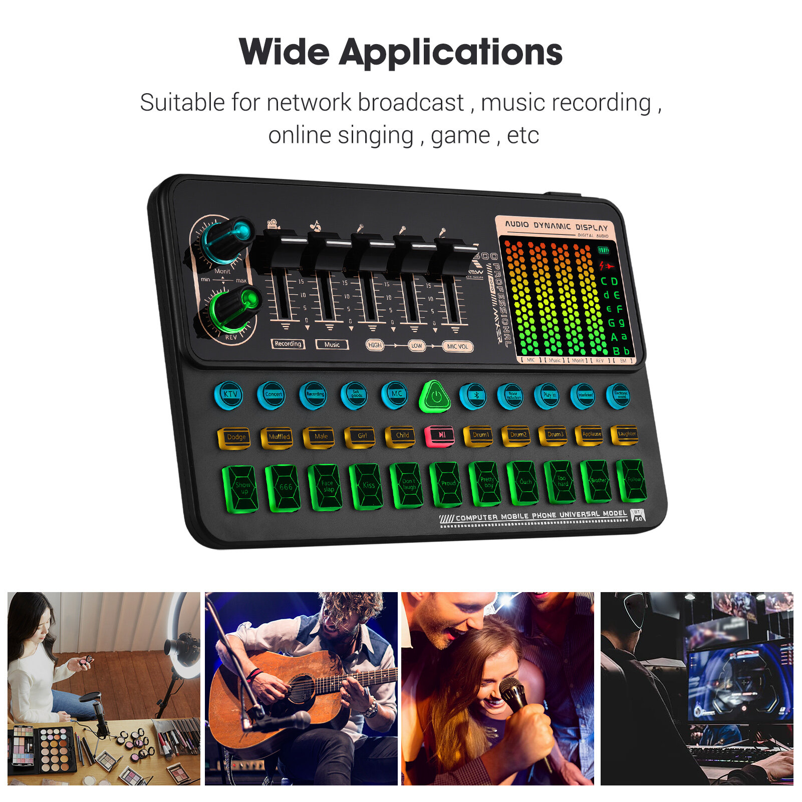 Multiple interfaces allows you to connect the sound card with smartphones, computers, earphone, microphone and speaker to make your live s-treaming more professional.