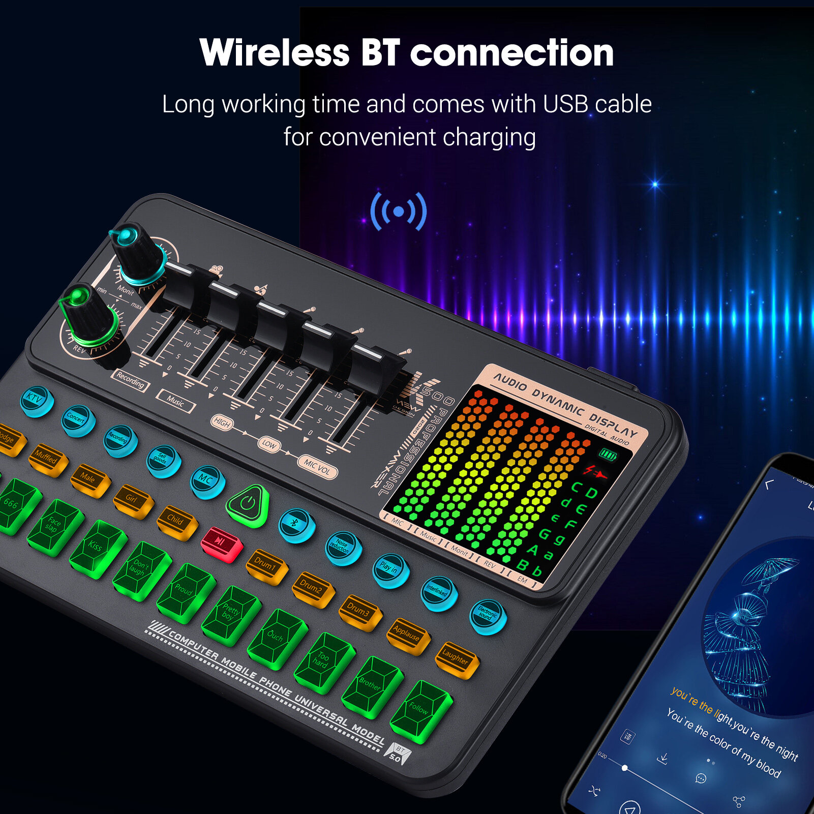 Built-in various interesting sound effects and scene modes, such as applause, laughter, KTV mode, concert mode, etc, which can c-reate different feelings and shorten the distance between you and your friends or fans.
