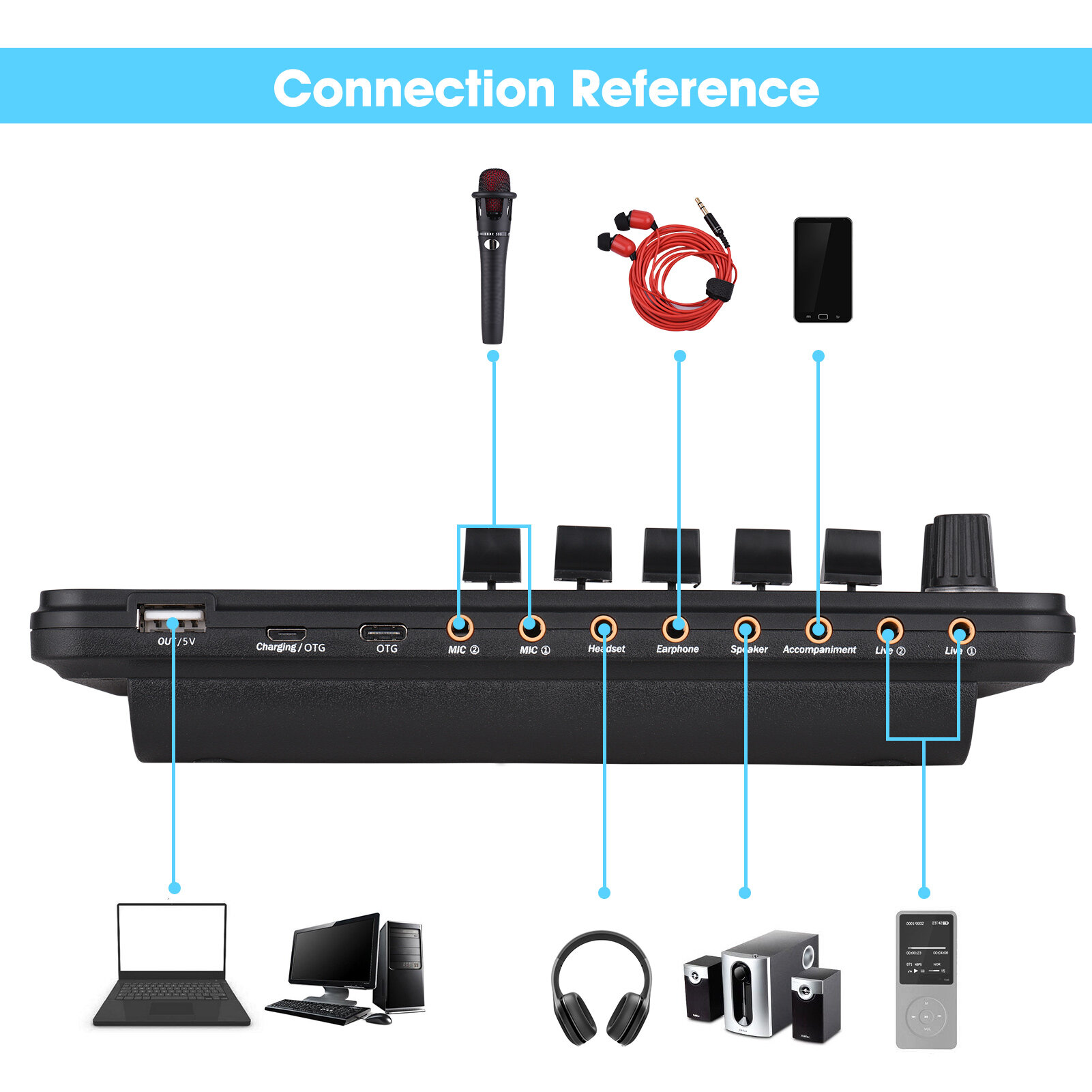 You can connect the sound card with your smartphone or computers via BT to p-lay accompaniment music, And the sound card can work with most mainstream live broadcast software also.