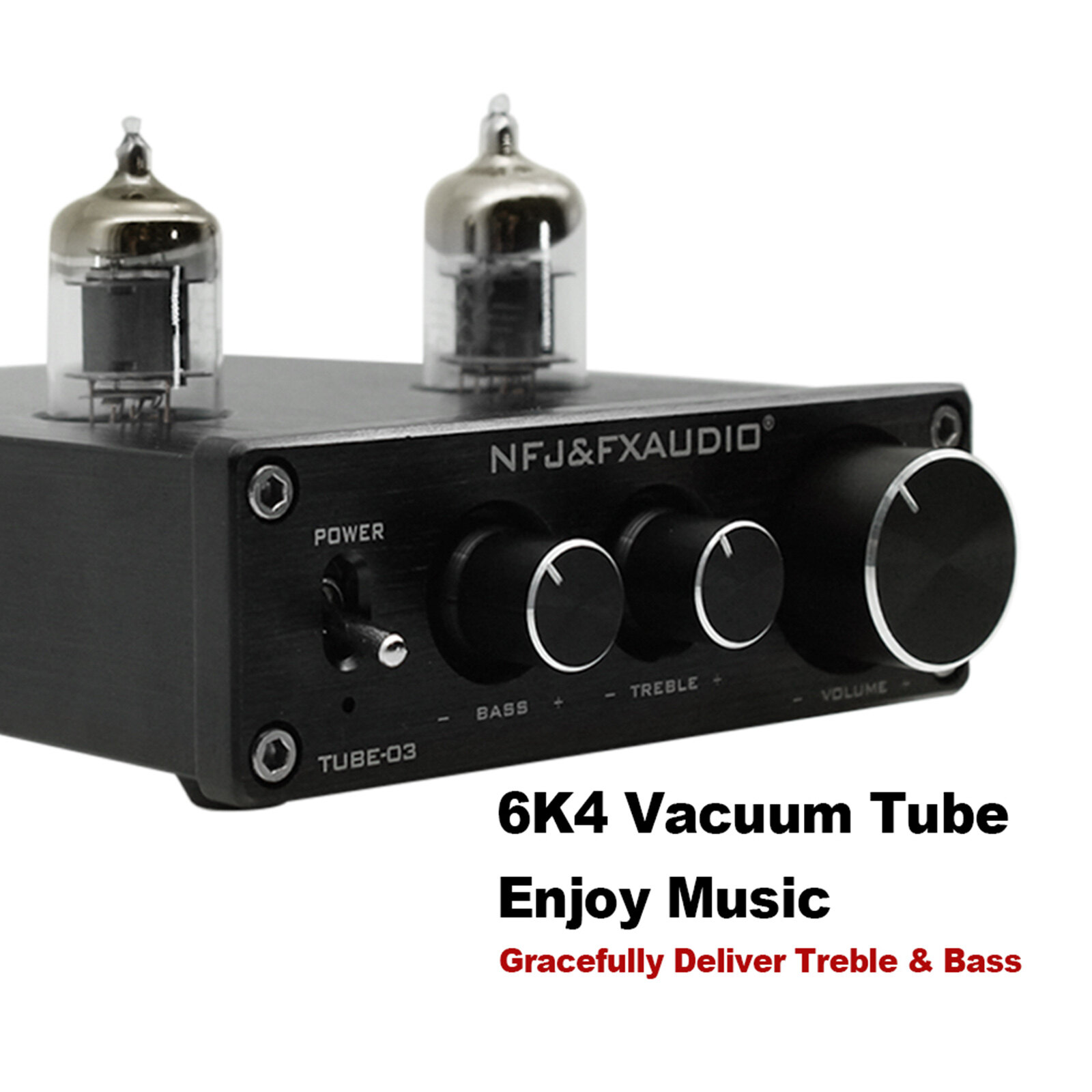 With a wide applied range and practicability, this preamplifier can fit the majority of active speakers and power amplifiers in the market. The replaceable 6K4 vacuum tubes design can optimize the circuit. The audio part and the power part are completely separated, which minimizes the interference to the sound. The timbre is soft and beautiful, sweet and warm, and with powerful bass, penetrating treble. With treble and bass adjustment, single power supply, it's small and portable, brings you much fun and convenience. Using high-quality aluminum alloy housing with gold-plated connectors, it's durable and high-performance.