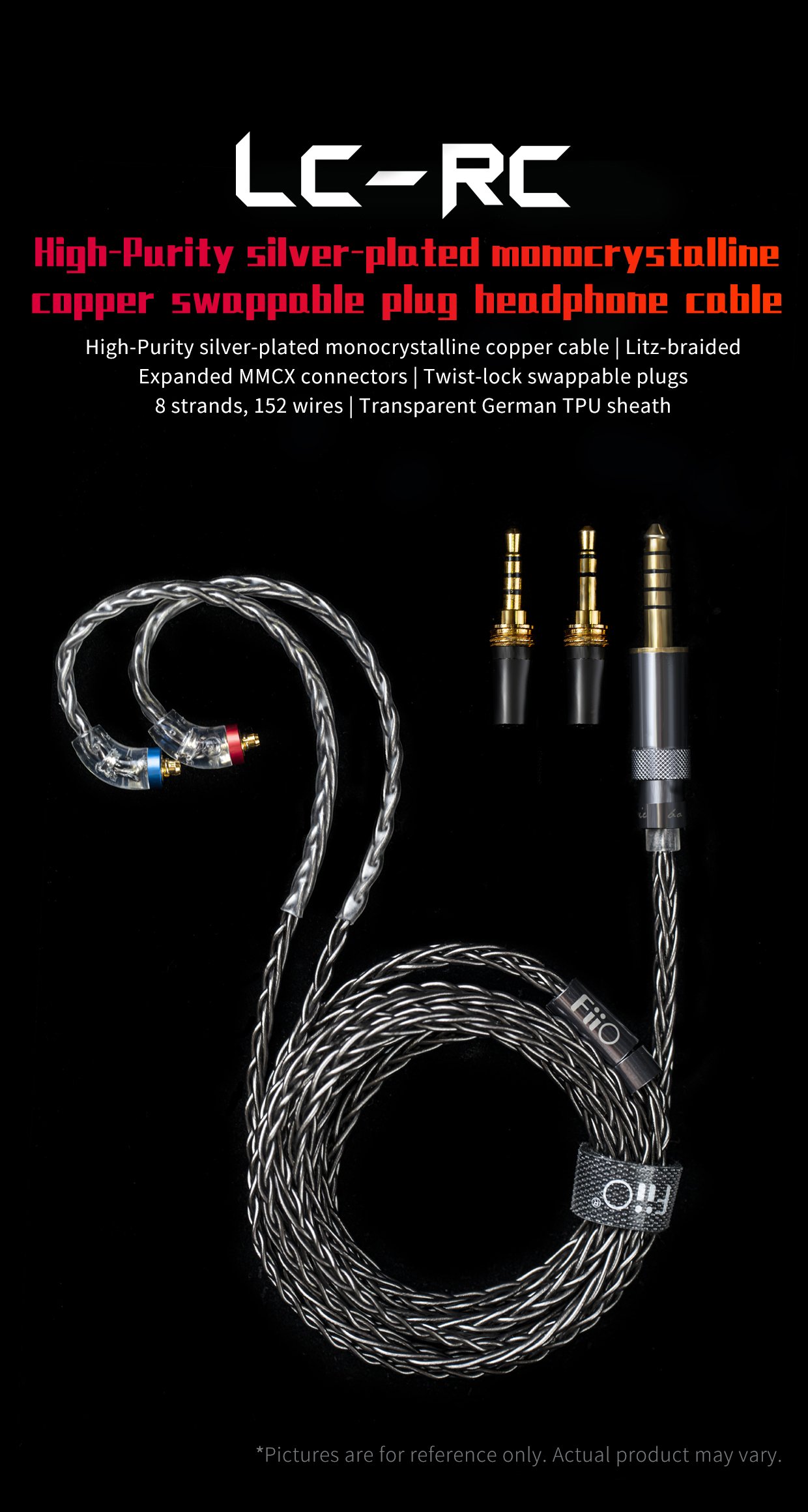 The LC-RC cable uses high-purity silver-plated monocrystalline wire – specifically, 8 strands of 19 cores each for a total of 152 wires. Each wire is individually isolated and all are braided together in the Litz style. This greatly minimizes the adverse skin and proximity effects and thus reduces the resistance of the wires, letting signals travel through the wire more easily and purely – improving high-frequency resolution in your music.