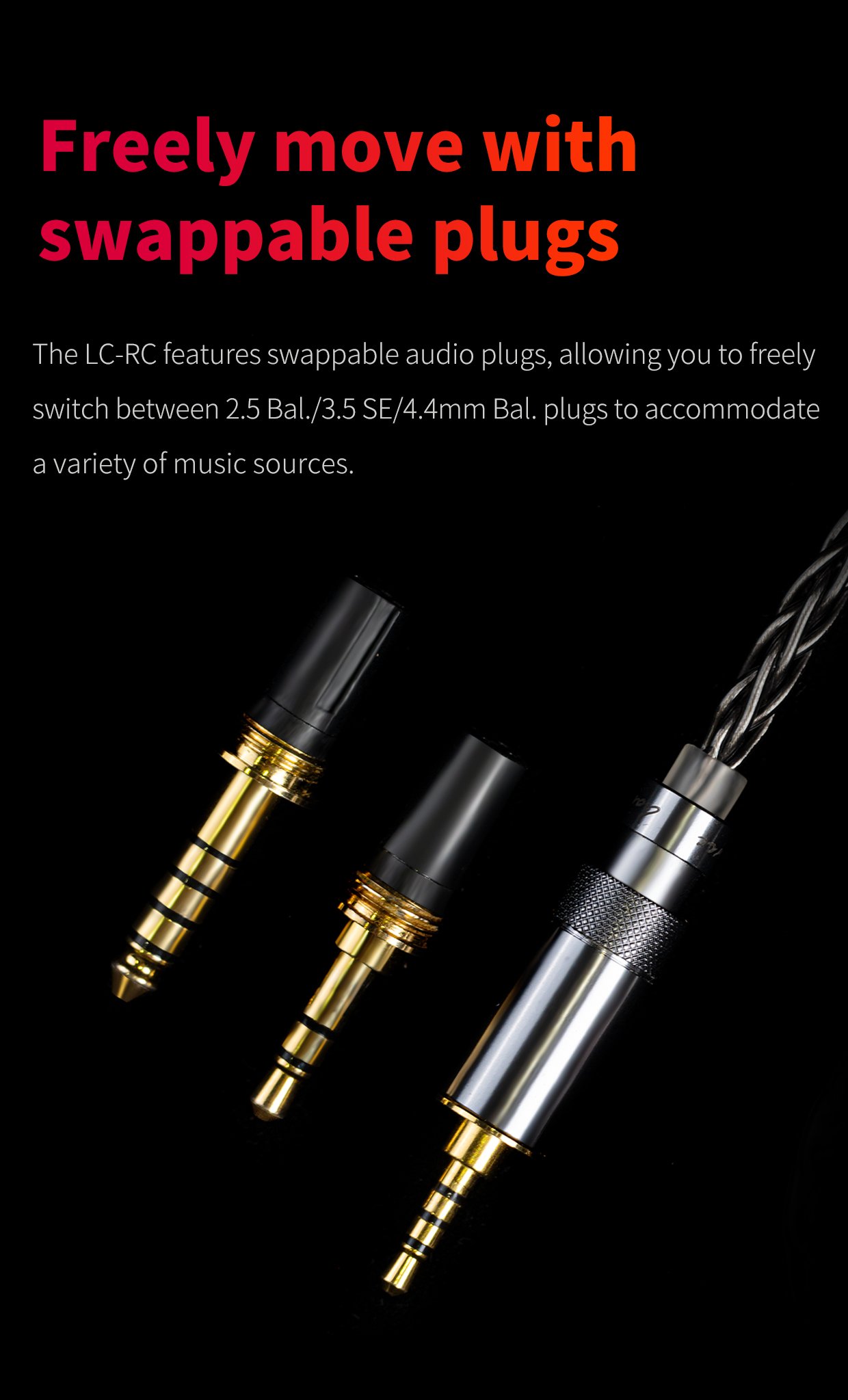The LC-RC features twist-lock swappable audio plugs, allowing you to freely switch between 2.5 Bal./3.5 SE/4.4mm Bal. plugs to accommodate a variety of music sources.
