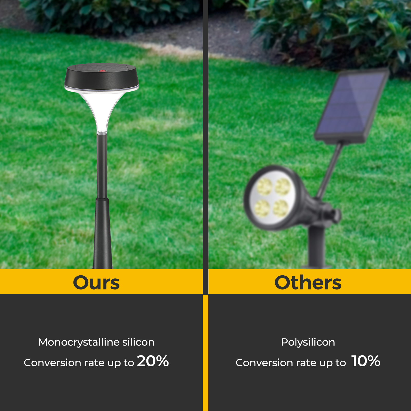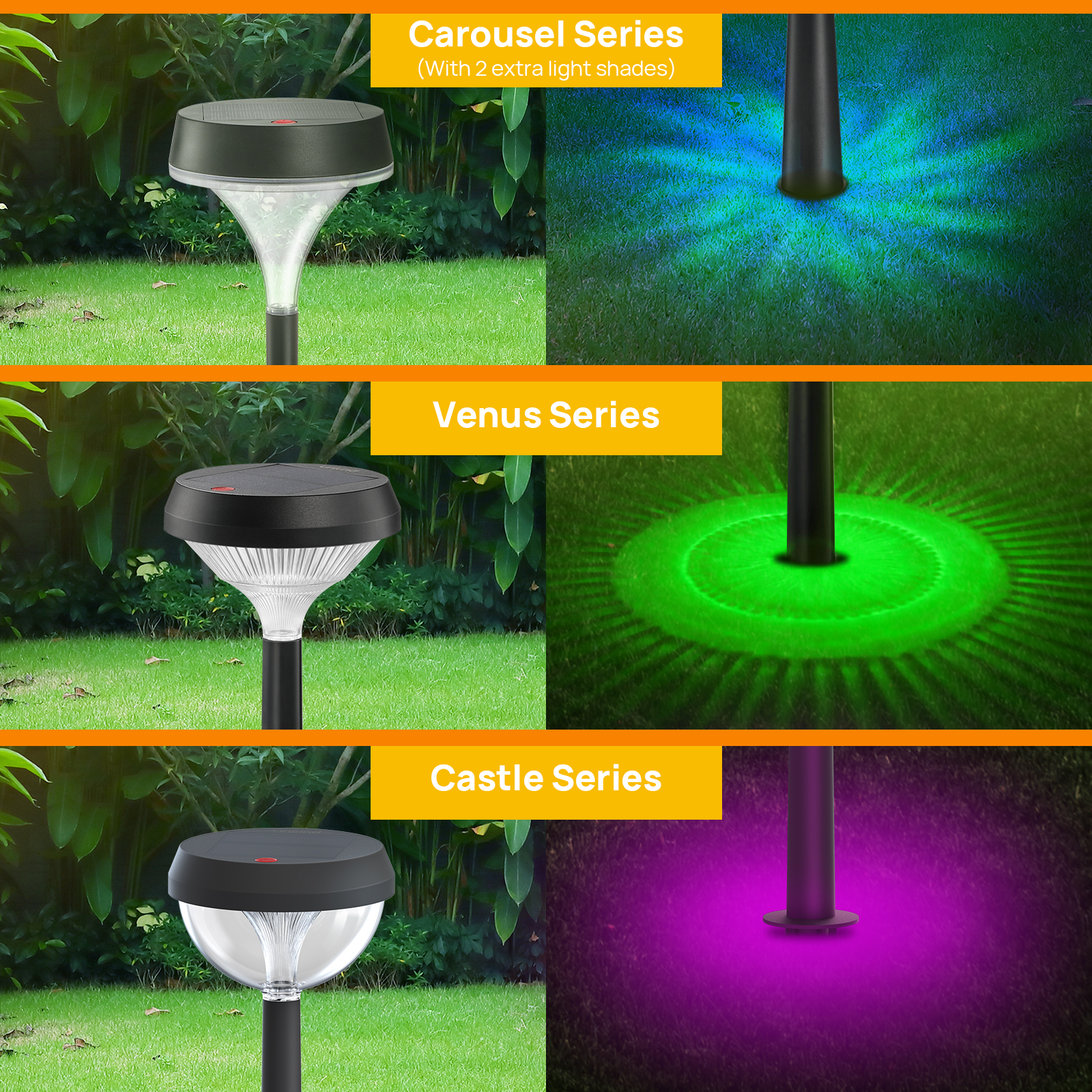 The solar pathway lights made of high-quality ABS (Acrylonitrile Butadiene Styrene) material and design with IP67 (Model 1) and IP54 super waterproof (Model 2&3). Compared with other outdoor solar lights below IP54, ours will not enter water and keep working even if it falls on the ground.