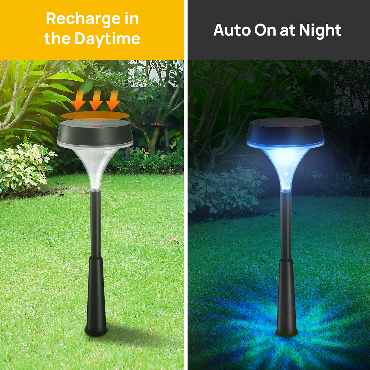 The solar garden light only needs 5H sunlight charging, then it can work up to 12H (6H in high light mode). It will auto turn on at night and auto turn off at dawn by sensing the brightness of surrounding environments.