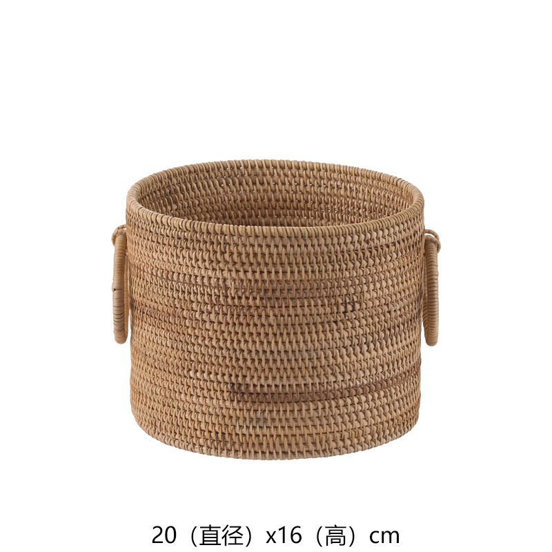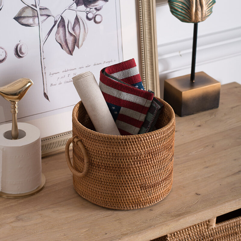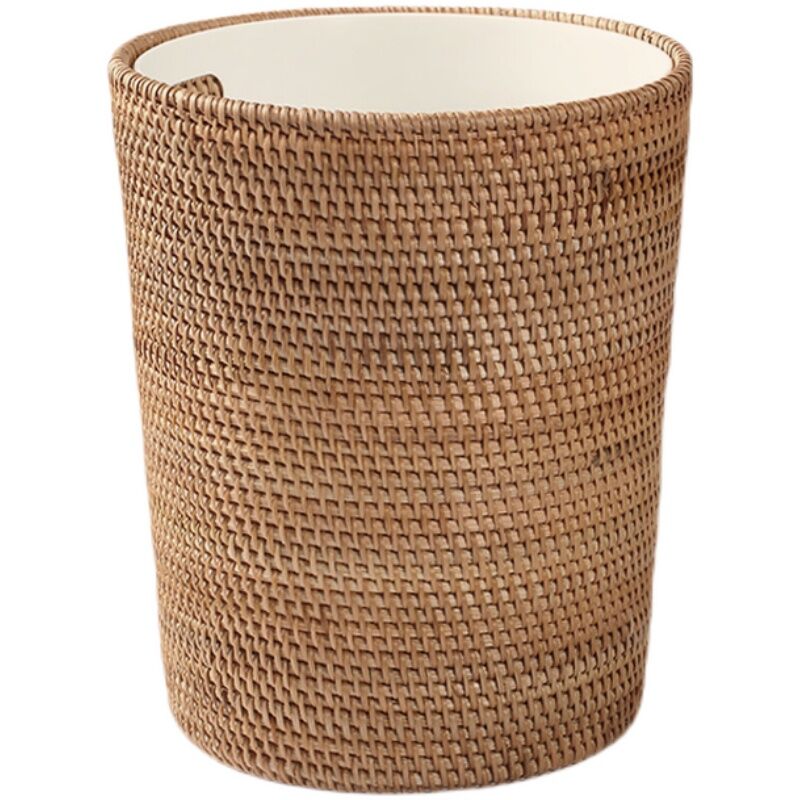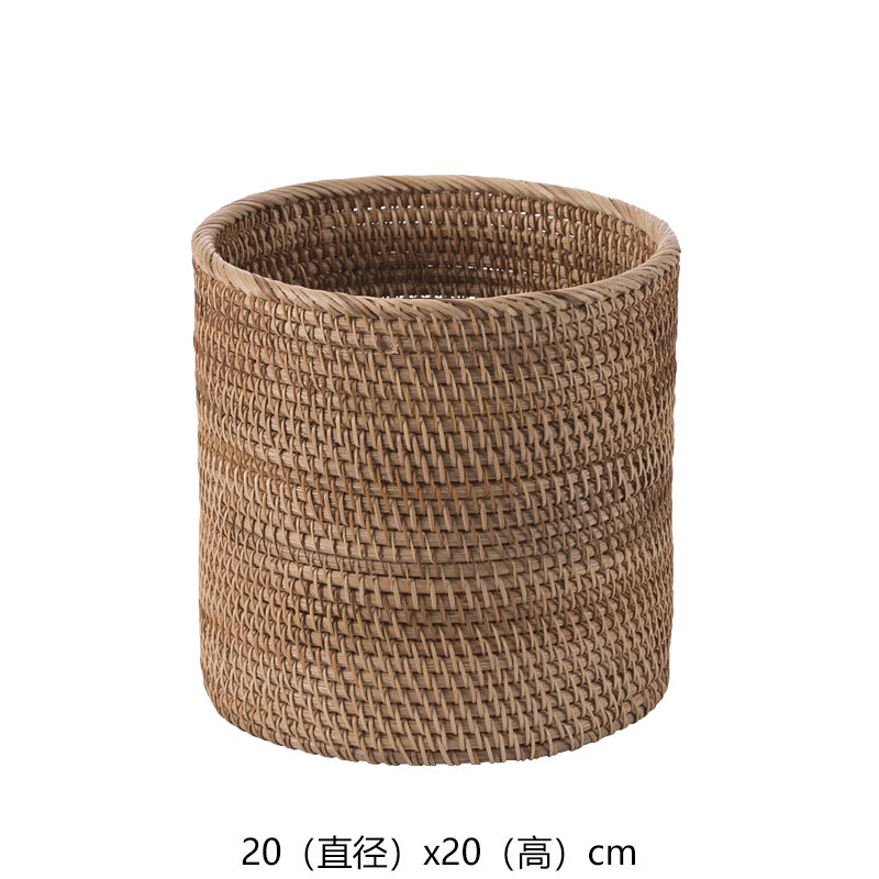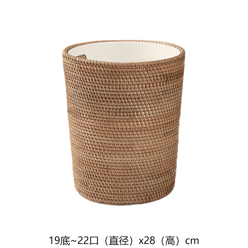 Solid Wood Rattan Household Living Room Trash Can round Bedroom Vintage Storage Bucket Handmade Personalized Study Desktop Paper Basket