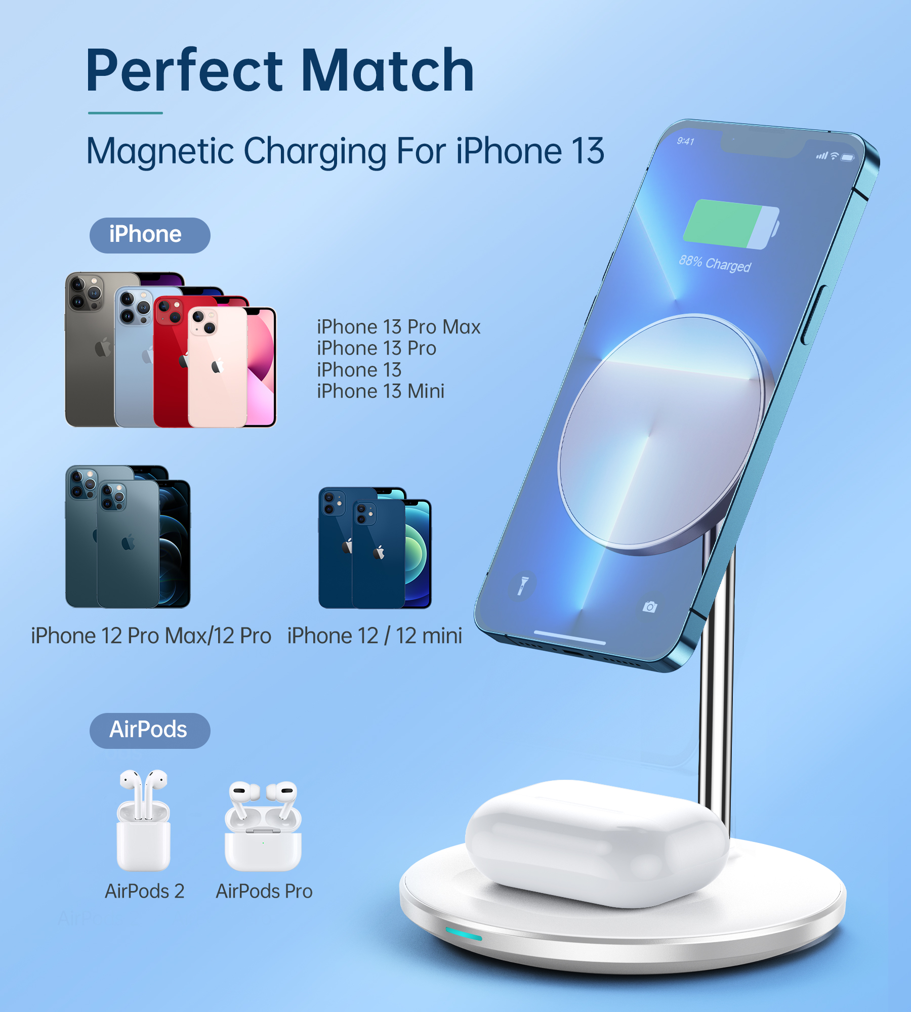 This magnetic iPhone charger station supports charging only for iPhone 13/13 Pro/13 Pro Max/13 mini 12/12 Pro/12 Pro Max/12 Mini and Airpods / Airpods pro / Samsung buds without connecting any extra cables.