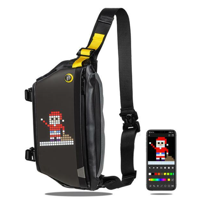 1. Four-layer storage design inside and outside 2. Waterproof (splashed raindrops)IP67 3. Connect to the APP to experience the exclusive creationPixoo-Slingbag is a stylish sling that suit your taste, yet verstile for for the urban daily life. It features a built-in LED screen and a mobile APP that lets you draw animation, display favorite logos, and communicate with others on your sling.so Sling bag is made of sturdy and durable polyester, water repellent. Lightweight, versatile, strong and sturdy rucksack. The lining is wear-resistant polyester and the colour will not fade• Create any pixel art animationeasily via the Divoom mobile application, or you can convert GIF to display. You can also type in the message and display it on your Sling Bag. Best of all, you can search your desired design from the a massive online gallery, and interact with other pixel art fans around the world.• 16x16 led screenProgrammable Pixel Art Led Display,you can Create your own pixel art, or pick a favorite one from the online gallery,also Team Logo,Memes,and Emoji,display anything you like on this stylish sling!• Pixoo sling bag is compatible with our remote controlwhere it will transform the sling into an indicator for the following traffic. You can also program different images and action to the remote buttons. Say good bye to the old school v-shape insert buckle. The manetic buckle is so easy to operate, and strong enough to hold your precioious cargos. Clip on, and clip off; you're good to go.The flexible strap of this chest bag can be adjusted,fit for normal size and plus size. A sling backpack is suitable for men, women even so cute for kids.• Lightweight Traveler & Sufficient CapacityThis Sling bag has three pockets: two at the front and one at the back. The front zipper bag can hold small objects for easy access. The main bag can hold mobile phone, wallet, charging treasure and so on. Finally, the back zipper bag is safe for mobile phone, cash and other valuables.Pixoo Sling bag offers different compartments to fit all your daily gears. Time to enjoy your journe
