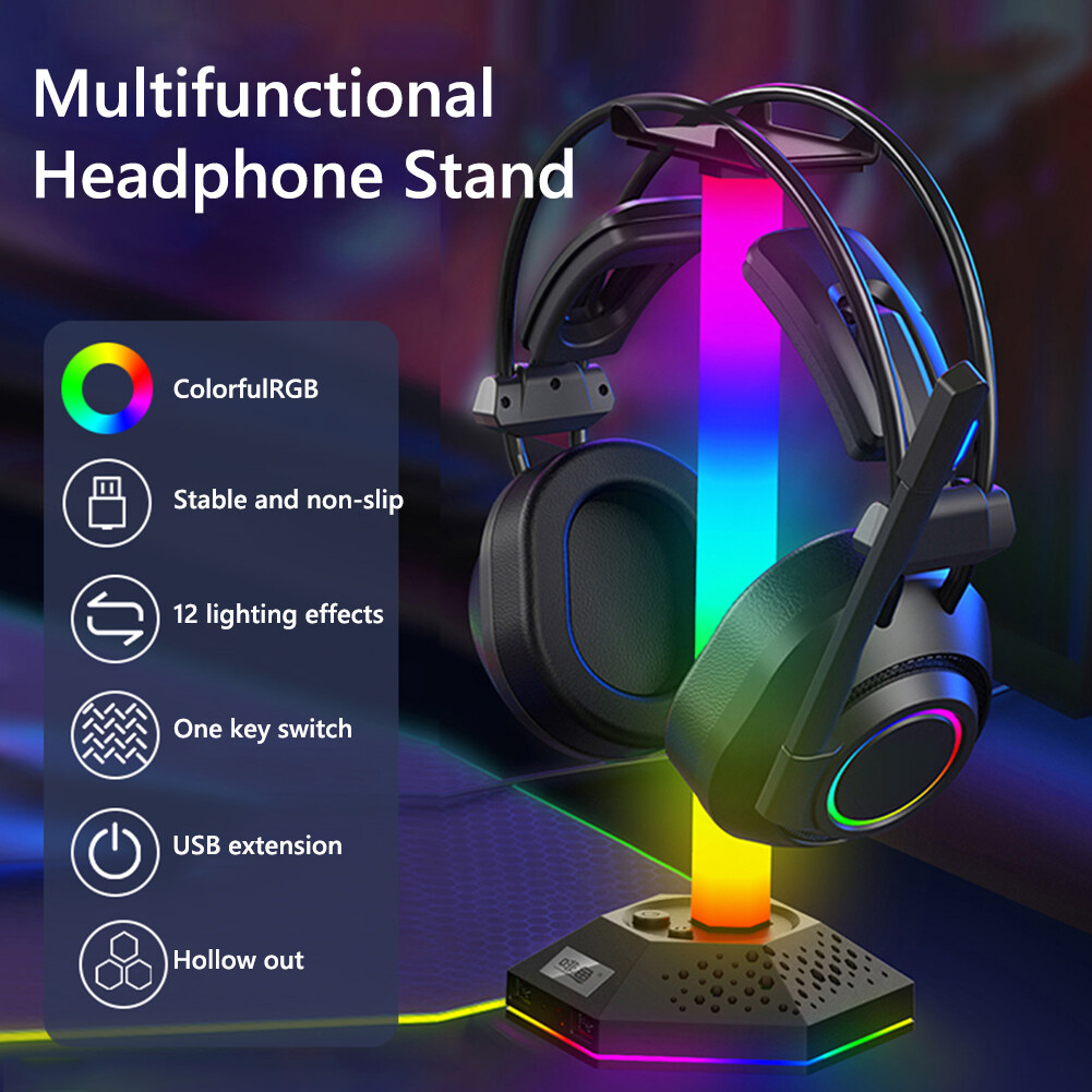 RGB Gaming Headphone Stand 12 Light Modes Headset Holder Bracket Universal Headphones Hanger Hollow Translucent Base Dual USB2.0 Expansion Interface 3.5mm Audio