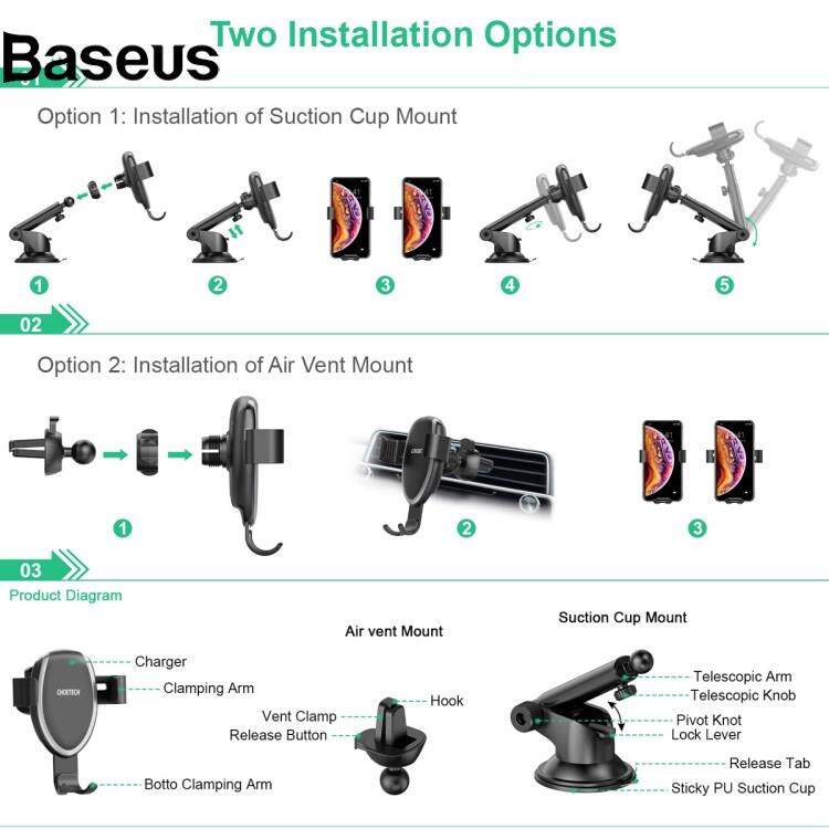Baseus CHOETECH T536-S 10W Wireless Charger Gravity Auto Clamping Suction Cup Mount Phone Holder with Air Vent Clip