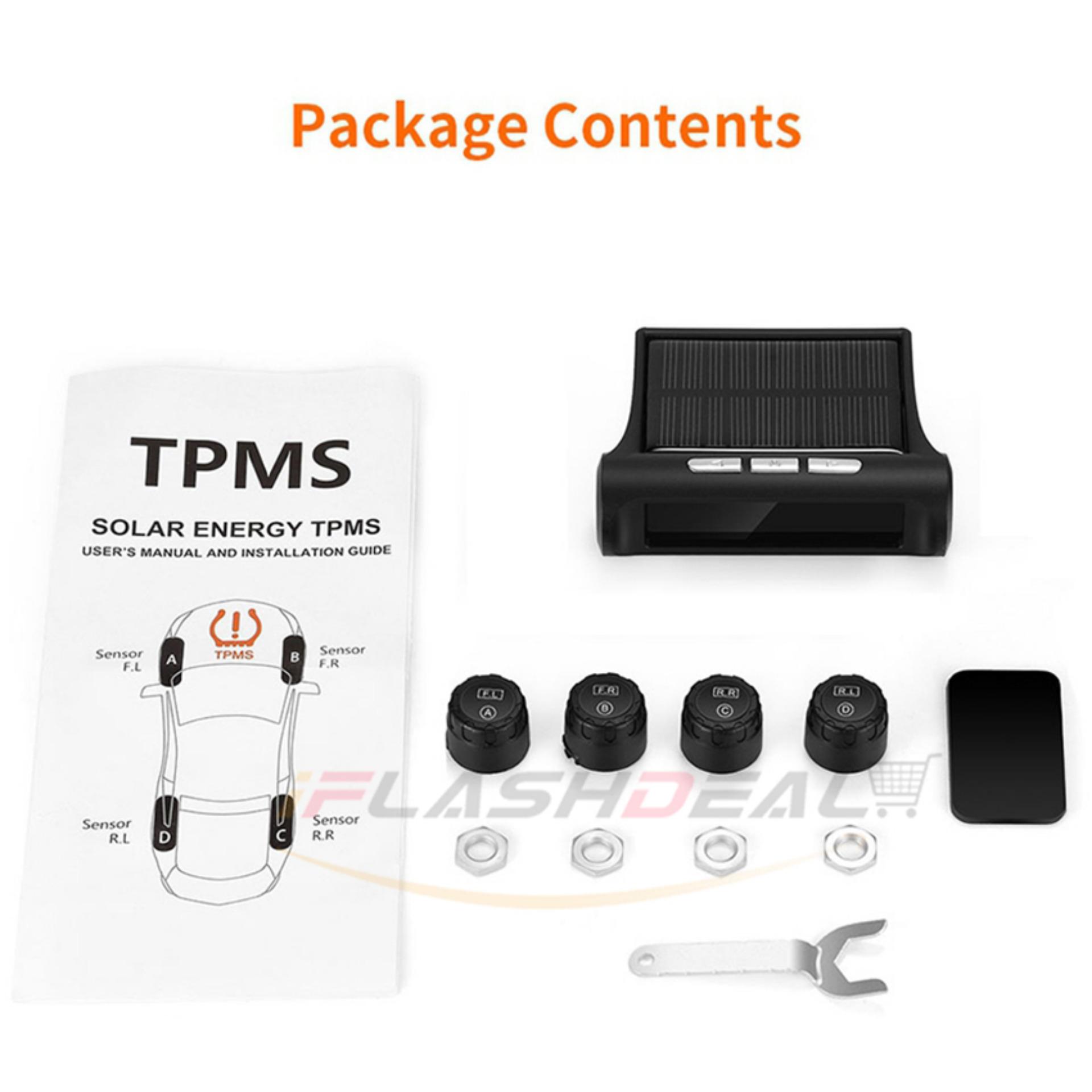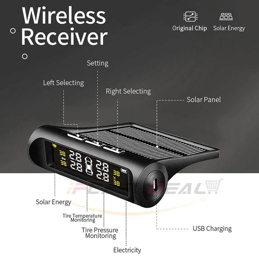 iFlashDeal Tire Pressure Monitoring System Car Tyre Pressure Alarm Solar Power Panel USB Charging TPMS Universal Wireless with 4 External Sensors Real-time LED Display Tire Pressure Temperature Detect
