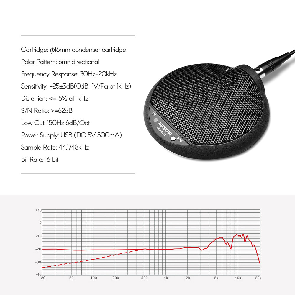 The digital boundary microphone tailored for network conference, network live broadcast, interview, etc. USB2.0 professional sound card chip without driver, plug and play, compatible with windows, iOS, Mac system.